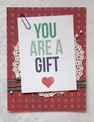 I started my card by picking out the sentiment I wanted to use. This pocket page card is from Recollections which can be found at Michaels. This is a great sentiment because it can be used for a variety of occasions or as a just because card. I paired this card with a fun x and o background from Pebbles. I thought this was a great way to use up a Valentine's themed paper without it being too themed. To dress up the card more I layered a doily behind the sentiment.